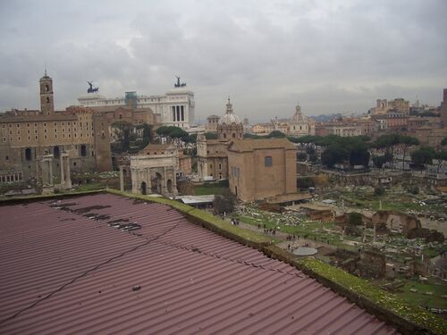 さらに左に目を転ずると セヴェルスの凱旋門や 元老院議場であるクーリア そしてタブラリウムと呼ばれる 公文書館の遺跡が 見えてきます そのさらに向こうには ヴィットリオ・エマヌエーレ2世記念堂が 白さを際立たせて建ちつくしています