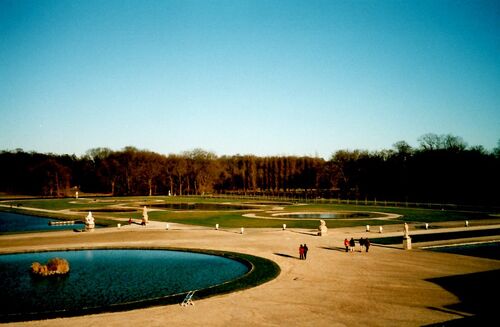 シャンティイ城の噴水とフランス式庭園 シャンティイの庭園の噴水そばから別方向を眺めます。整った形のフランス式庭園の右隣には木々が生い茂っています。このあたりは英国・中国風庭園(Le jardin anglo-chinois)となります。18世紀末に造られました。シャ…